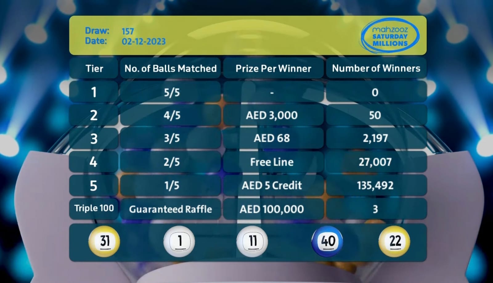 - فاز 135,492 مشاركاً بالجائزة الخامسة التي تبلغ قيمتها 5 دراهم لكل منهم بعد مطابقة رقم واحد من أصل الأرقام الخمس الفائزة لتبلغ القيمة الإجمالية لجوائز هذه الفئة 677,460 درهماً